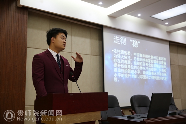 本网讯 4月23日上午,中国(贵州)高校传媒联盟主席团换届大会在beat365明辨楼道德讲堂召开,贵州高校传媒联盟秘书长白皓、前主席团成员及全省40家高校会员媒体共同参加,本次换届共有十三名同学参与竞选。