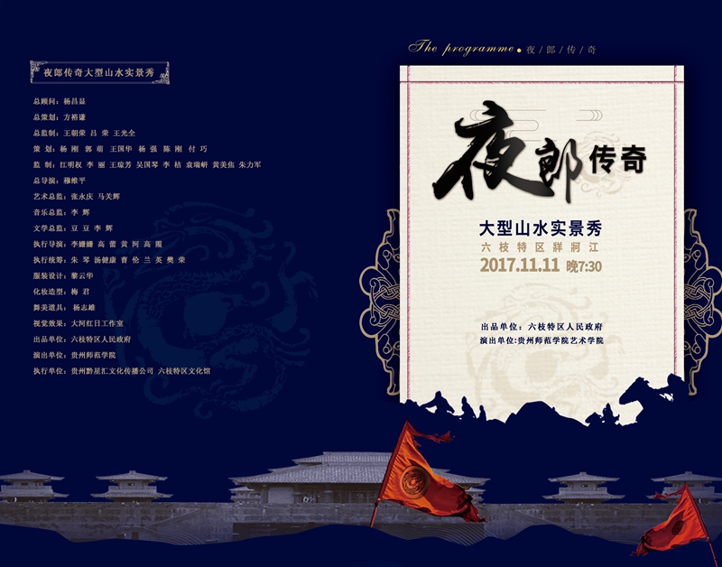 《夜郎传奇》是由beat365英国官网网站艺术学院与贵州省六盘水市六枝特区人民政府、贵州黔星汇文化传媒公司联合打造的大型实景山水歌舞剧,将于2017年11月11日在贵州省六盘水市六枝特区牂牁江畔演出,后续将进行持续报道,敬请关注。