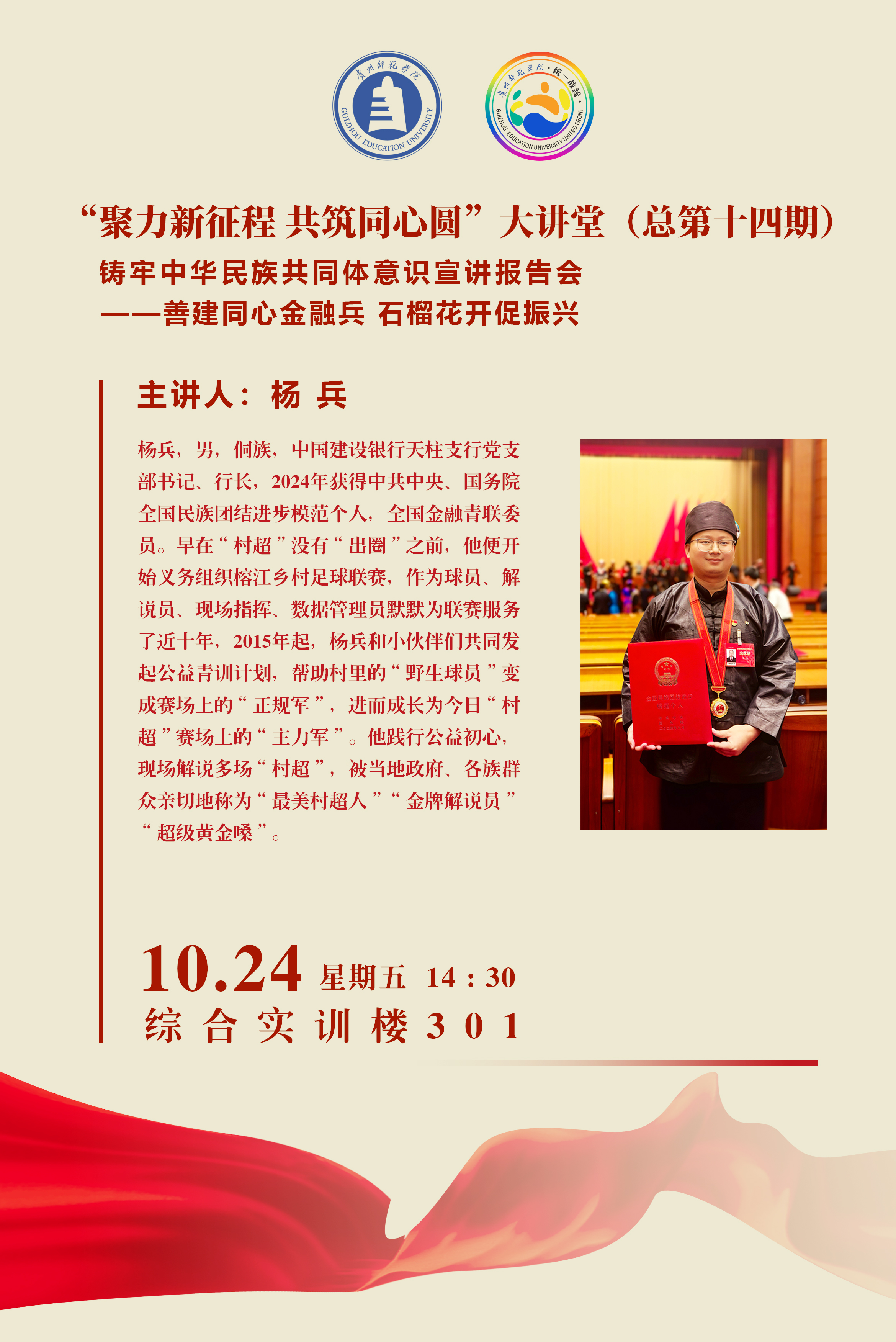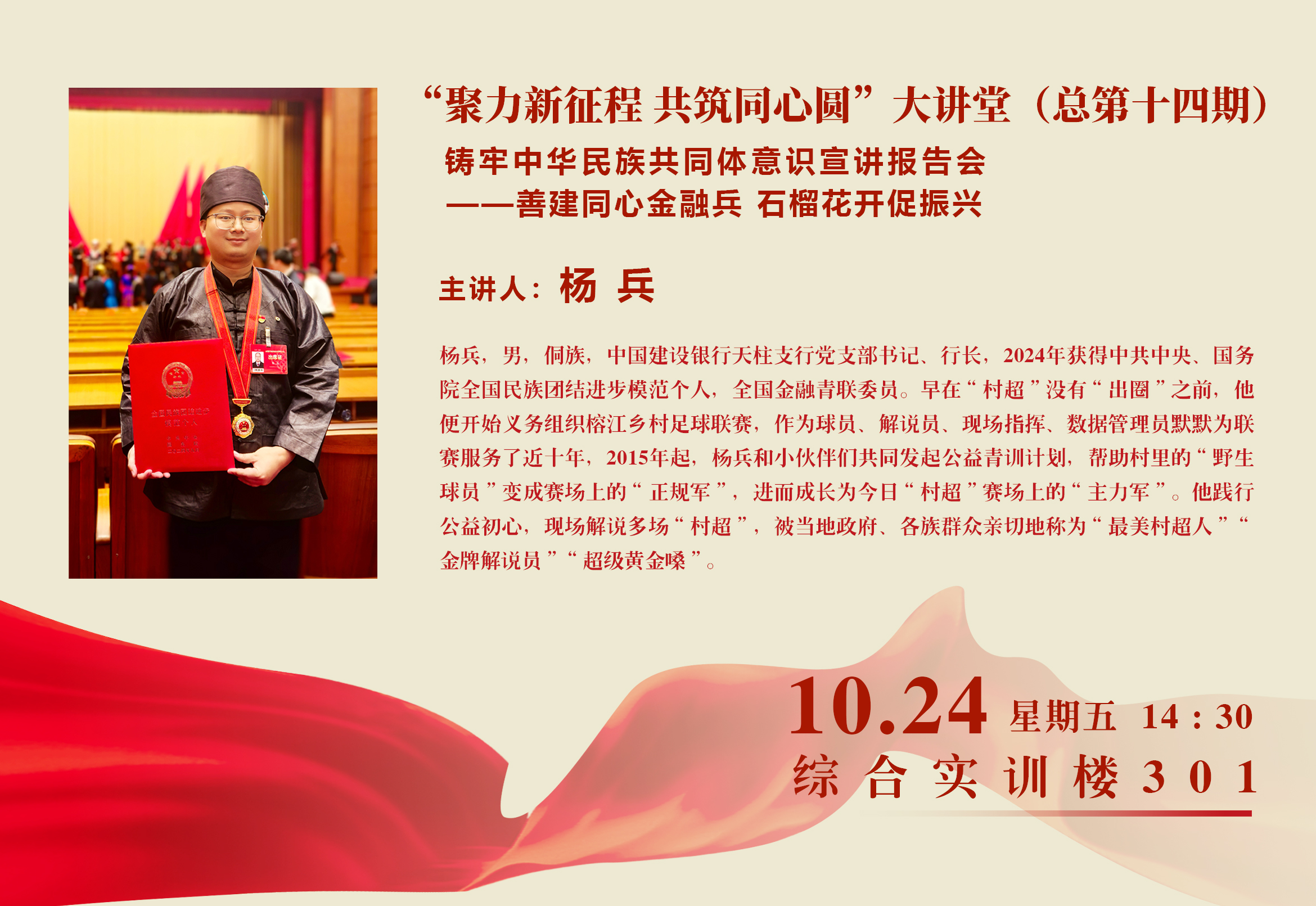 杨兵,男,侗族,中国建设银行天柱支行党支部书记、行长,2024年获得中共中央、国务院全国民族团结进步模范个人,全国金融青联委员。早在“村超”没有“出圈”之前,他便开始义务组织榕江乡村足球联赛,作为球员、解说员、现场指挥、数据管理员默默为联赛服务了近十年,2015年起,杨兵和小伙伴们共同发起公益青训计划,帮助村里的“野生球员”变成赛场上的“正规军”,进而成长为今日“村超”赛场上的“主力军”。他践行公益初心,现场解说多场“村超”,被当地政府、各族群众亲切地称为“最美村超人”“金牌解说员”“超级黄金嗓”。