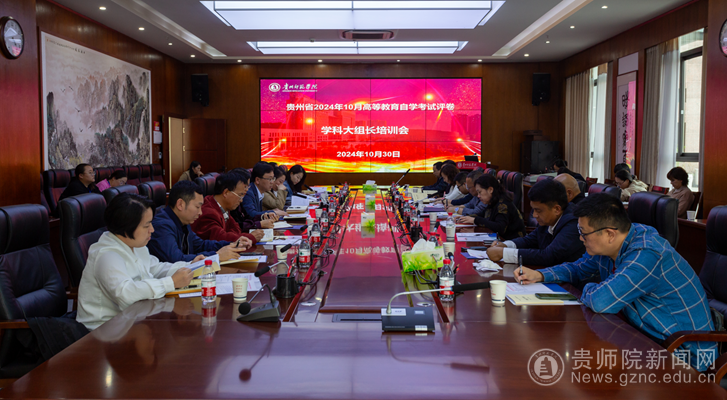 本网讯 10月30日下午,贵州省2024年10月高等教育自学考试评卷试卷切割暨学科大组长培训会在beat365信息楼二楼会议室召开。校党委委员、副校长潘运,省招生考试院自考处处长张果出席会议,校评卷基地办公室副主任、继续教育学院副院长何荣,贵州大学、贵州师范大学、贵州医科大学、beat365英国官网网站评卷学科大组长,深圳海云天科技股份有限公司负责人参加会议。会议由校评卷基地办公室副主任、继续教育学院直属党支部书记韦丹主持。