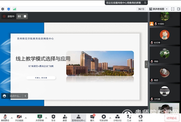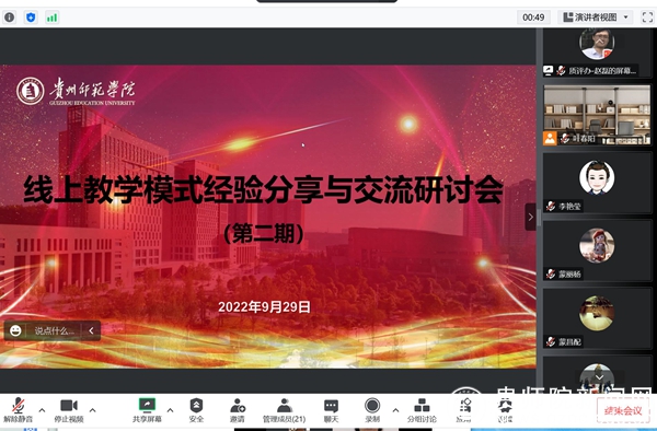 交流发言环节,校级督导周筑文老师作了《理工科线上教学督导》的经验分享,对理工科线上教学督导中发现的亮点和特点、问题和不足进行了总结,并对如何开展好线上教学的提出了建议;校级督导张莹老师、黄天明老师对线上课程教学督查工作的开展情况、线上课程建设、线上教学平台的使用等问题进行了交流讨论。