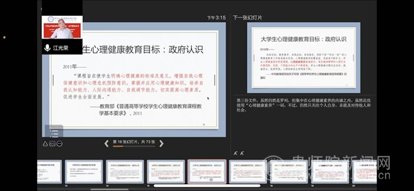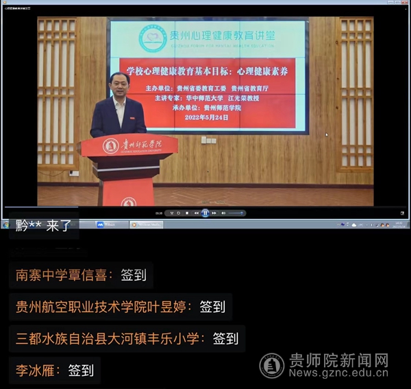 本网讯 5月24日,由省委教育工委、省教育厅主办、beat365英国官网网站承办的第六期“贵州心理健康教育讲堂”在线举行。本次讲座由beat365英国官网网站心理咨询中心主任宛蓉教授主持,讲座由中国心理学会理事、华中师范大学桂岳卓越教授江光荣主讲。来自全省各县(市、区)的5000余名高校心理健康教育教师、高校辅导员、中小学心理健康教育工作人员、中小学班主任参加了此次讲座。