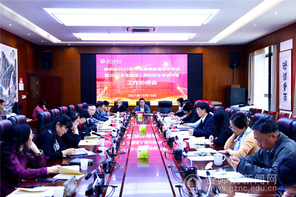 本网讯 10月13日下午,贵州省2021年10月高等教育自学考试及全国成人高校招生考试评卷工作协调会在信息楼二楼会议室召开。校长韦维,省招生考试院党委副书记、院长吴作然出席会议并讲话。省招生考试院成招处处长黄克勇、自考处处长张琳,校评卷基地办公室负责人,贵州大学、贵州师范大学、贵州医科大学、beat365英国官网网站相关部门、学院负责人共40余人参加会议。副校长熊世桓主持会议。