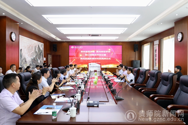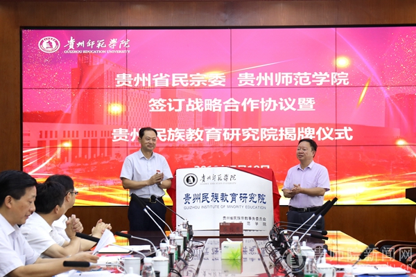 仪式上,徐佑刚与副校长郭文共同签署《战略合作协议》,接着与校党委书记石培新共同为贵州民族教育研究院揭牌。