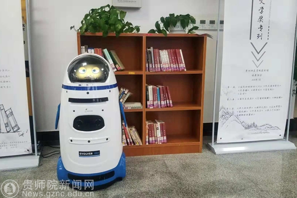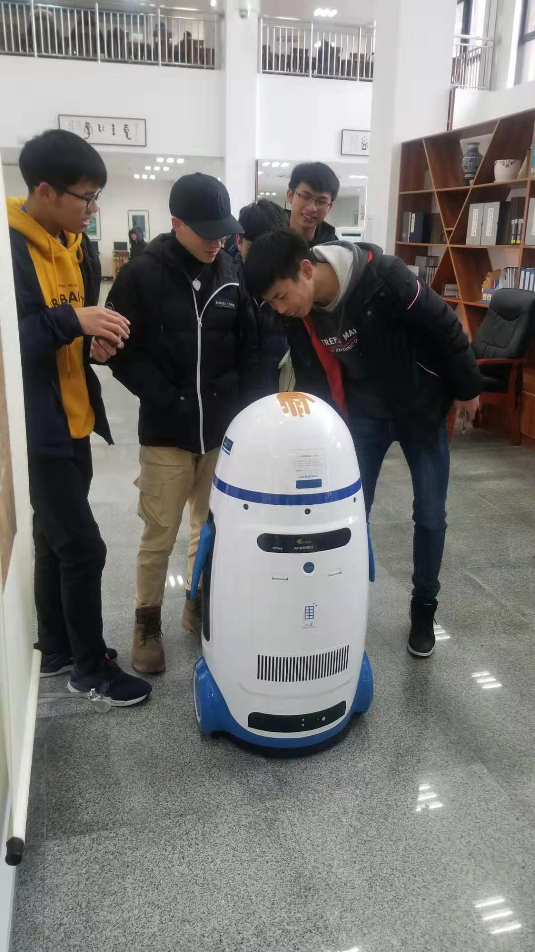 与朗读亭的文化品味配套的,是我馆一楼大厅投入试用的丁小胖机器人,引起同学们的极大兴趣,“丁小胖”造型憨态可掬,在已导入图书馆大厅地图的条件下,可以带领读者到指定的区域。图书馆各部室老师也设立了相关的常识数据,使得该机器人能语音解答读者们的常规问题,还能根据要求为读者唱歌、跳舞,甚是可爱。