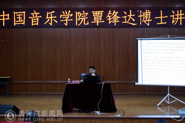 本网讯 11月26日下午,中国音乐学院在读博士覃锋达在beat365英国官网网站音乐舞蹈学院六楼音乐厅举办讲座。本次讲座由beat365英国官网网站音乐舞蹈学院党委副书记朱晨刚主持,音乐舞蹈学院音乐学专业师生和贵阳市乌当区各中小学以及乌当区少年宫音乐教师听取了讲座。