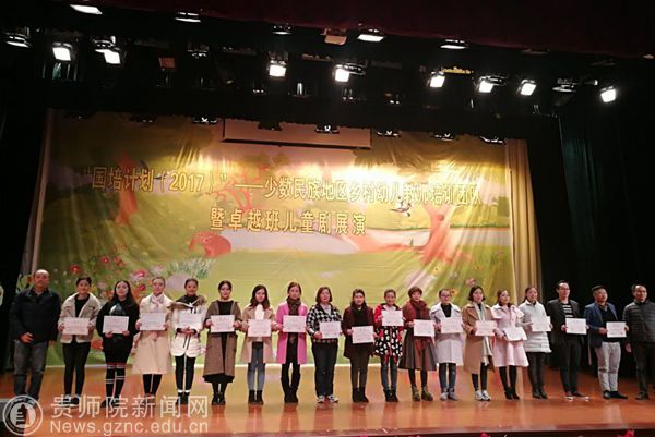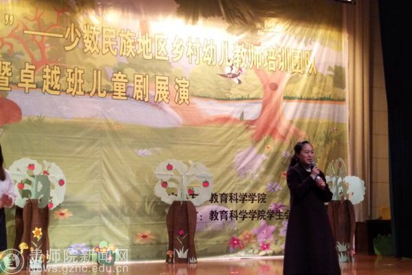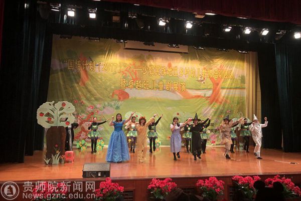 表彰结束后进入“国培计划(2017)” ——少数民族地区乡村幼儿教师培训团队暨卓越班儿童剧展演环节。卓越班的同学们给大家表演了儿童剧《月亮的味道》、国培班的学员们带来了经典童话故事《葫芦娃》、《白雪公主和七个小矮人》、《绿野仙踪》串演。儿童剧是本次培训的重要成果之一,较好体现了培训学员综合素质的提升。