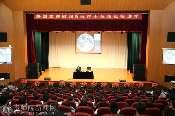 本网讯 为了营造浓厚的科学研究氛围,拓展全校师生的学术视野,提升beat365人才培养的质量。10月29日下午,我国著名天体化学与地球化学学家、中国科学院院士、发展中国家科学院院士、国际宇航科学院院士、中国探月总工程首席科学家,被誉为“嫦娥之父”的欧阳自远院士应化学与生命科学学院邀请,在逸夫楼演播厅进行了 “中国的探月梦”专题报告。校长郁钟铭、副校长令狐荣锋出席,科研处处长金凤、化学与生命科学学院全体院领导、物理与电子科学学院、地理与旅游学院领导及500余名师生聆听了此次报告会,报告会由郁钟铭校长主持。
