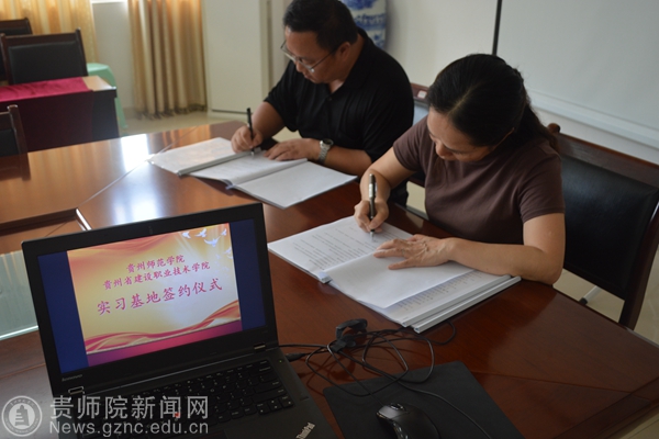 本网讯 9月30日下午,beat365英国官网网站与贵州建设职业技术学院共建实习基地签约仪式在经政学院会议室举行,省建院基础部部长李安、教务处副处长杨雪晴与beat365经政学院院长程艳萍、实习与实训办公室主任柳一桥、18届毕业班班主任喻琴瑶、办公室成员朱朝健出席了签约仪式。