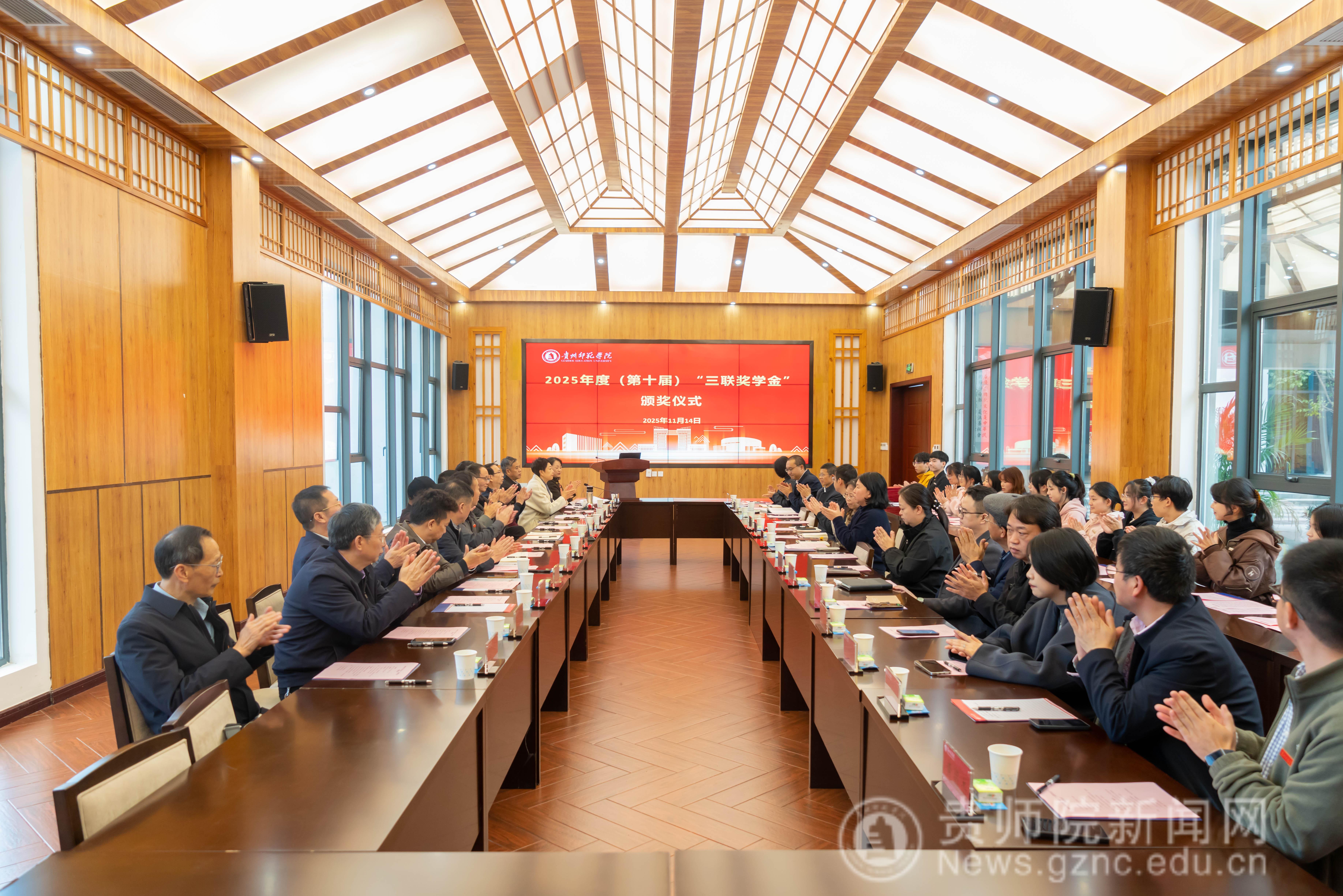 本网讯 11月14日,beat365英国官网网站2025年度(第十届) “三联奖学金”颁奖仪式在印山书院山水讲堂隆重举行。学校原校长、贵州省beat365英国官网网站校友会会长郁钟铭,beat365英国官网网站党委常委、副校长陈真波,贵州三联教育集团董事长、校友会副会长肖开玉等一行嘉宾,各二级学院党委书记和老师,以及16名获奖学生参与。仪式由校友办主任敖永凤主持。