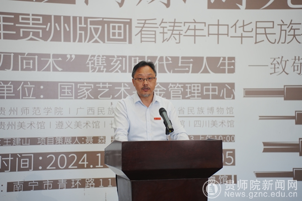 韦维校长出席了本次展览开幕并发表致辞。在致辞中,韦维校长深刻回顾了贵州与广西之间文化交流的历史脉络,指出本次展览不仅是对百年贵州版画艺术的集中呈现,更是黔桂两地文化交流的一次重要契机。通过版画这一独特的艺术形式,观众能够深刻感受到贵州高原的壮美风光、丰富民俗和悠久历史,从而进一步加深对贵州文化的理解与认同。同时,韦维校长强调,本次展览的成功举办,将进一步加深黔桂两地的文化友谊,促进两地文化艺术的交融互鉴,为新时期里两地文化艺术交流的新篇章增添浓墨重彩的一笔。