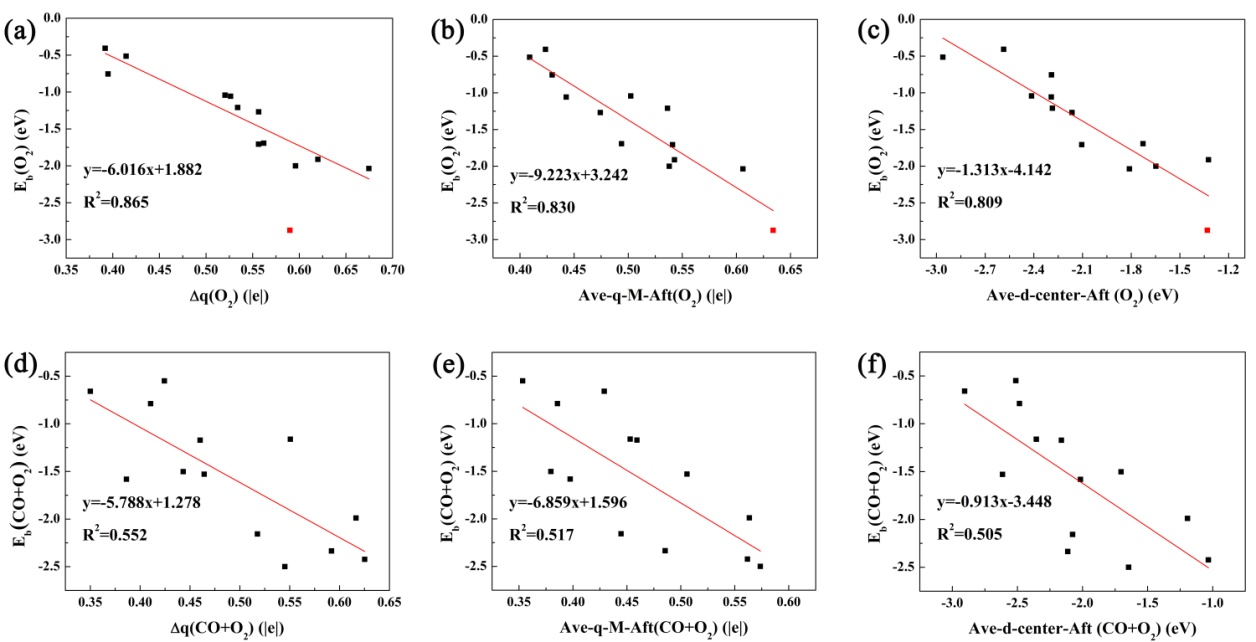 基于上述高活性配位模型,作者系统研究了5种常用过渡金属(Fe、Co、Ni、Cu和Pt)的不同组合模式的催化活性。结果表明,含Fe组合的催化性能要普遍优于其它模型,且Fe-Ni催化活性最高。为了探索可以表征不同组合结构催化性能的描述符,作者进一步详细计算了各类模型的电子结构,并以此为基础构建了50组构效关系。对比分析发现,电荷转移、双金属所带电荷的平均值以及双金属d轨道中心位置的平均值都可以作为单一反应物(如O2)吸附稳定性的描述符(如图3所示)。但是,对于多分子反应物(如CO+O2),只有关键吸附物的吸附能和反应能垒描述符具有良好的线性关系。