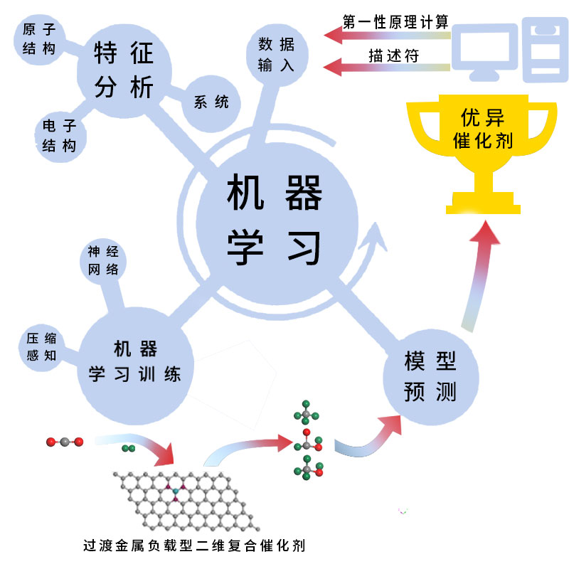 本工作通过对多种双原子二维复合材料表面催化性能的研究,提出了电荷转移、活性金属平均带电量、活性金属平均d轨道中心、关键吸附物以及伸缩振动光谱等多种活性相关的描述符。结合作者之前的相关研究成果,如极化电荷描述符(J. Mater. Chem. A, 2021, 9, 2093,一区,IF:12.732)、吸附能描述符(J. Mater. Chem. A, 2020, 8, 12485,一区,IF:12.732)、电偶极矩描述符(ACS Appl. Mater. Interfaces 2019, 11, 9629,一区,IF:9.229)、d轨道中心描述符(Adv. Mater. 2018, 30, 1705369,一区,IF:30.849;ACS Appl. Mater. Interfaces 2016, 8, 10315,一区,IF:9.229)等,这些都为机器学习与大数据分析研究提供了很好的理论基础(如图5所示)。在后续研究中,作者将以相关二维复合催化材料为模型开展高通量计算,针对海量的计算结果进行数学统计分析。一方面基于已有的经验性公式进行验证,另一方面采用神经网络、随机森林等人工智能技术,对大量数据进行机器学习的训练,挖掘背后的构效关系。最终,优化、设计出一些催化活性高、稳定性好的新型二维复合催化材料。