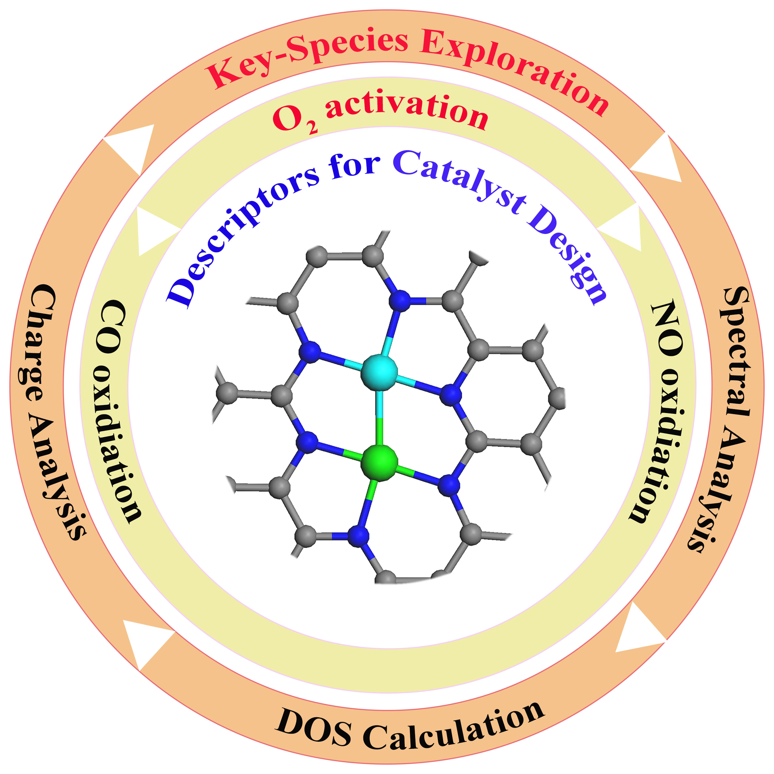 二维复合催化材料的理性设计可以极大的节约实验试错成本,从而显著提升其合成效率和经济效益。因此,与之密切相关的活性描述符的探索近年来逐渐成为了催化领域的研究热点。然而,复合催化剂的微观原子结构自由度非常大,其电子结构的复杂性也非常高,给活性描述符的系统性研究带来了极大的挑战。为了解决这一难题,本工作基于第一性原理模拟,以氮化石墨烯负载型双原子过渡金属体系为标准模型,对其表面CO催化氧化性能的各种影响因素进行了全面系统的研究,并提出了电荷转移、金属带电量、金属d轨道分布、关键吸附物以及伸缩振动光谱等多种活性相关的描述符(如图1所示)。这些发现洞察了催化剂微观结构与催化性能的内在构效关系,并且各类电子结构描述符的确立将能助力未来的高通量研究,以期利用人工智能技术从大量的数据中找到具有较强可迁移性和普适性的活性描述符,为二维复合催化剂的合成提供全新的设计理念。