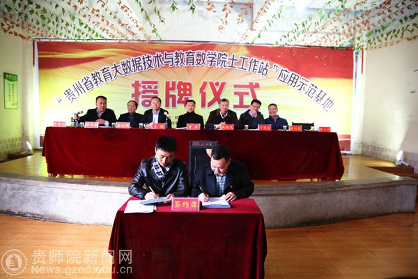 beat365英国官网网站数学与计算机科学学院副院长熊伟程与洪水镇人民政府镇长李小祥分别代表院士工作站及洪水镇人民政府签订了“共建贵州省教育大数据技术与教育数学院士工作站应用示范基地”协议,同时还分别代表学校和洪水镇人民政府签订了“共建教育实践基地协议”。左羽院长分别代表学校、院士工作站、教育大数据工程中心向洪水镇教育管理中心负责人授牌:“教育实践基地”、“院士工作站应用示范基地”、“教育大数据技术应用示范基地”。