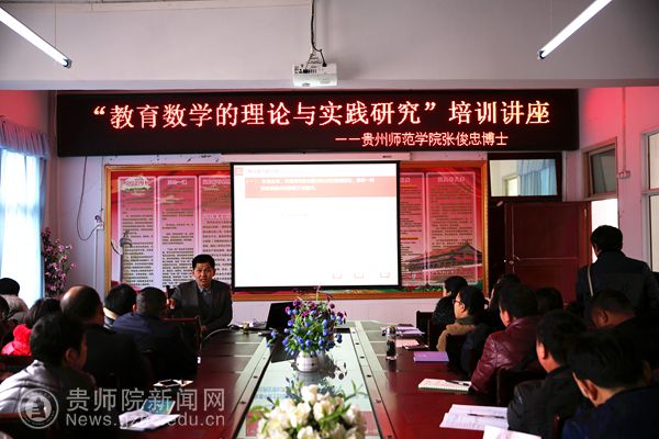 授牌仪式过后,还开展了相关的活动,首先是院士工作站专家团队成员、贵州省乡村名师张天信工作室顾问张俊忠博士为参会的老师们开展了“教育数学的理论与实践研究”培训讲座;其次院士工作站专家团队成员梅俊雷老师也为参会的老师们开展了“网络画板的应用”专题培训;再次来自凯里五中的实验教师欧春龙为全体参会人员上了一节教育数学示范课。最后是“教育数学的理论与实践研究”教学研讨活动,在活动中beat365数学与计算机科学学院党委副书记李艳琴教授就“如何开展张景中院士的教育数学实验”作了全面的分析和指导,上海市特级教师、数学教育专家周继光、黔西县原政协副主席、数学特级教师蒋远辉也对活动进行指导。