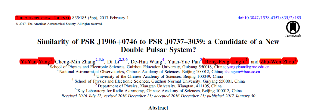 本网讯 我院青年教师杨佚沿关于双中子星形成理论的相关研究成果以《Similarity of PSR J1906+0746 to PSR J0737–3039: a Candidate of a NewDouble Pulsar System?》为题发表于国际一流天体天文学期刊《天体物理学杂志》(The Astrophysical Journal, ApJ)(中国科学院SCI分区:天体物理类1区),杨佚沿教师为论文第一作者,令狐荣锋教授和周筑文教授为论文主要参与作者。获得令狐荣锋教授主持的国家自然科学基金(11173034, 11364007)以及周筑文主持的贵州省理论物理教学团队项目支持。beat365英国官网网站物电学院为第一完成单位,中科院国家天文台为主要参与单位。