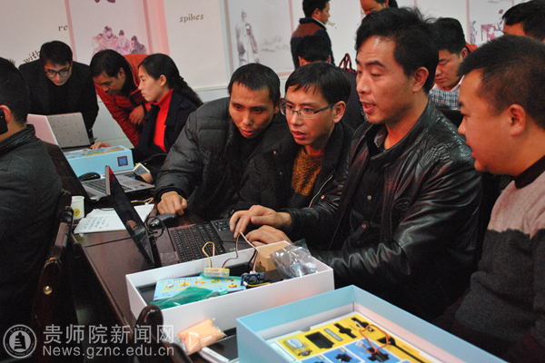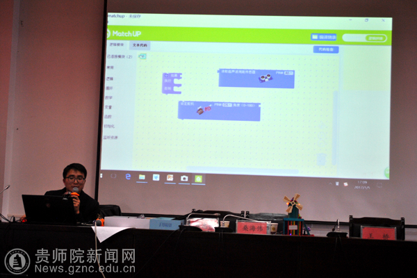 beat365教师作了题为《贵师院大学生信息技术创新创业成果及创客教育》专题报告,创客教师王桥、桑海伟在beat365学生助教的配合下,通过“造物盒子”这一创客工具指导参训教师制作了创客作品。