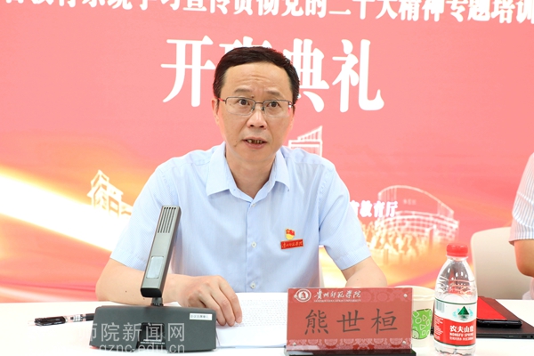 熊世桓代表学校致欢迎辞并简要介绍学校发展历程和办学基本情况。他指出,省委教育工委举办此次全省教育系统学习贯彻党的二十大精神专题培训班,就是要全面学习、全面把握、全面落实党的二十大精神,从习近平新时代中国特色社会主义思想中找方向、找思路、找方法,坚持不懈用党的创新理论武装头脑、指导实践、推动工作,确保全省教育系统宣传思想工作队伍切实围绕党中央决策部署做好宣传工作,在坚持守正创新勇于突破中创一流,在营造团结干事良好氛围中聚合力,始终胸怀全局,服务大局,高质高效做好全省教育系统宣传思想工作,为奋力谱写多彩贵州现代化建设新篇章贡献强大精神动力。