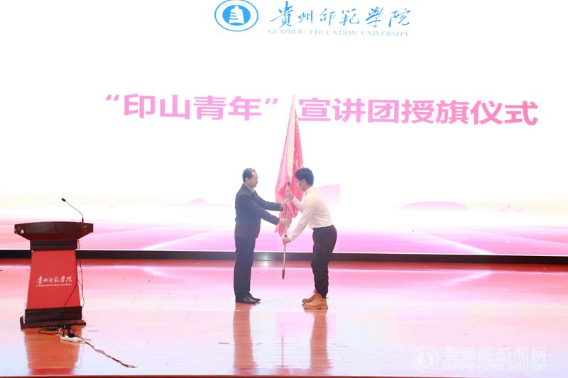 随后,校党委委员、组织部部长杨昌顺宣读“印山青年”宣讲团导师名单与宣讲成员名单,校党委书记石培新给“印山青年”宣传团授旗,并与校党委委员、副校长任洁为宣讲团导师及成员代表颁发聘书。