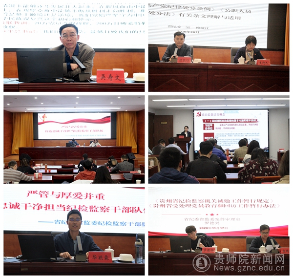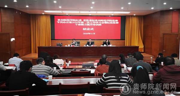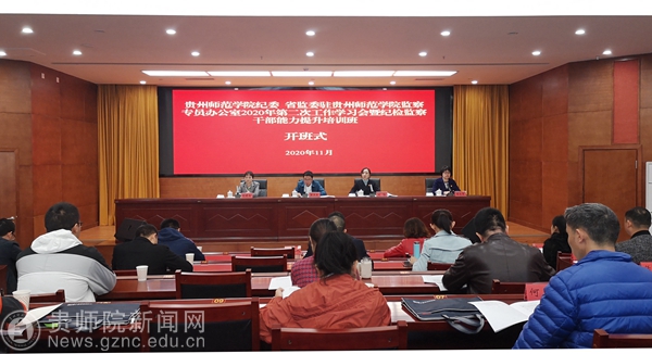 本网讯 11月15日至17日,正值全国上下掀起学习宣传贯彻党的十九届五中全会精神热潮之际,beat365在贵州省纪检监察干部学院举办了2020年纪检监察干部第二次工作学习会暨能力提升培训班。校党委委员、纪委书记、省监委驻校监察专员韩兵兵出席。省纪委省监委派驻第十一纪检监察组组长吴寿文亲自到堂作专题辅导讲座。
