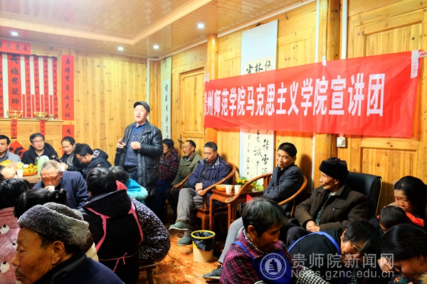 在黔溪村宣讲时,周永杰结合国家的脱贫攻坚大战略对十九届四中全会的会议精神进行了宣讲,并指出此次会议准确把握了我国国家制度和国家治理体系的演进方向和规律,突出坚持和完善党的领导制度,抓住了国家治理的关键和根本,对于更好发挥我国国家制度和国家治理体系的各种显著优势,确保党始终成为中国特色社会主义事业的坚强领导核心,具有重大而深远的意义。学院老师们还结合“不忘初心、牢记使命”主题教育向村民们宣讲中国共产党的初心所在,即为中华民族谋复兴,为中国人民谋幸福,“谋”复兴,“谋”幸福,不仅有宏观上的制度构建,更有对民生疾苦实实在在的面对与切实解决。村民们你一言我一语,从历史到现实的比较与回忆,充满着对中国共产党与社会主义制度的由衷钦佩、拥护与感恩。