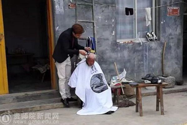 峨岭关村邀请理发店给老人免费剪发
