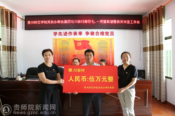 6月28日,在川岩村脱贫攻坚座谈会上,石培新与参会党员一起重温入党誓词,beat365英国官网网站组织部部长伍燕上了一堂精彩的微党课示范课。beat365英国官网网站党政办主任芦军、组织部长伍燕一同将社会资助的伍万元“农村老旧住房农用电改造款”捐赠给川岩村。