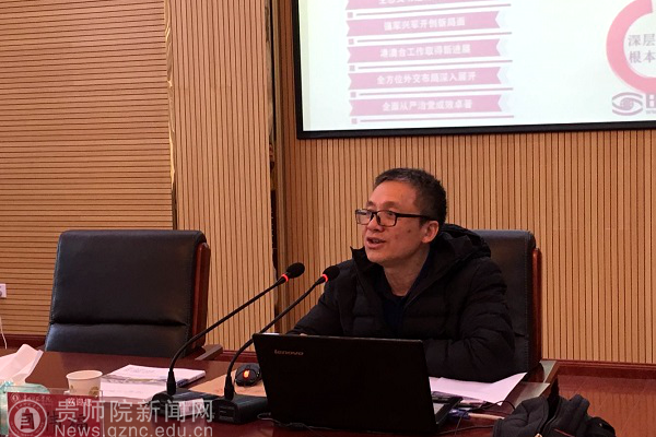 本网讯 12月25日,根据《贵州省委教育工委 教育厅关于<学习宣传贯彻党的十九大精神“七进”工作之进校园工作方案>通知》的要求,在逸夫楼艺术学院会议室,贵州省委教育工委高校马克思主义学院院长宣讲队成员、贵州财经大学马克思主义学院院长何伟福教授到beat365宣讲党的十九大精神,马列主义教学部教师代表、经济与政治学院思想政治教育专业学生代表80余人参加了学习报告会,学习报告会由马列主义教学部负责人王天桥主持。