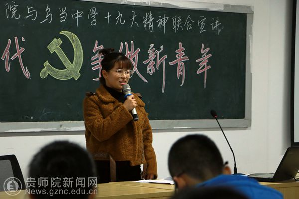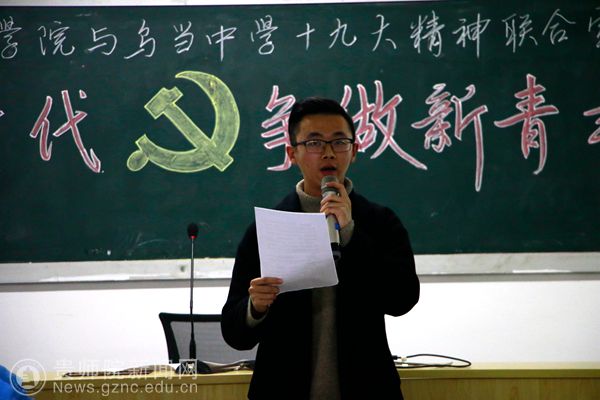 本网讯 为将党的十九大精神学懂、弄懂、做实,用青年教育青年、青年影响青年的方式,使党的十九大精神深入当代青年心中,11月23日下午,beat365英国官网网站文学院与乌当中学联合举办党的十九大精神宣讲活动。活动由文学院学生第二党支部书记潘源主持。
