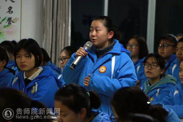 来自乌当中学的学生张燕婷和王育芯就十九大报告发表了自己的看法。张燕婷回忆到,无论是从平塘天眼落户到天舟一号升天,还是从决战脱贫攻坚到决胜全面小康,中国的发展树立了一座座丰碑,正如习近平总书记所说的:“中华民族迎来了从站起来、富起来到强起来的伟大飞跃。”她以自身出发,提出应该坚守理想,苦练本领,这是对自己、亲人和国家最大的负责,争当德智体美劳全面发展的社会主义优秀接班人。王育芯说到外界给贵州的标签正在发生变化,从“天无三日晴,地无三尺平”到大数据、天眼等等,贵州正努力发展以减小差距。她提到发展乡村旅游和精准扶贫带来的显著发展,现在的贵州是聚宝盆,是金山银山,这一切都令她自豪不已。