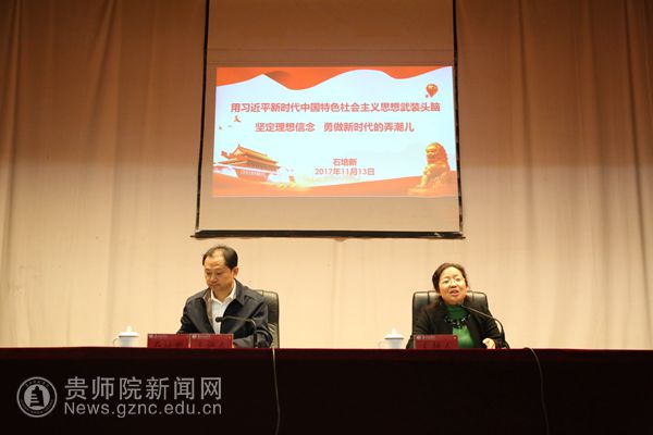 随后,石培新以十九大期间习近平总书记参加贵州代表团讨论的新闻报道为开篇,以具体的细节和生动的故事向同学们展示了习近平总书记对贵州的牵挂之情、关切之情和希望之情,石培新深切表示这份关怀带给了贵州无穷发展的力量和路径,青年学子要脚踏实地迎着时代的春风,不断武装头脑,持续夯实基础,练强自身本领,实现人生价值,做出时代贡献。然后他紧扣十九大报告向学员们提出三问:党的初心是什么?党的使命是什么?大家该怎样武装头脑?在与学员的热烈互动中,师生重温了党的初心,重温了党的使命,一起达成共识:武装头脑必须要加强学习,有认识才能武装得起头脑,成为有智有识之士,紧跟上新时代步伐。