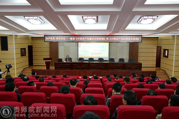 本网讯 3月31日下午,贵州省委党校教授、贵州省省情研究会副会长郝建应邀到校主讲了题为 “从严治党、担负责任”—— 解读《中国共产党廉洁自律准则》和《中国共产党纪律处分条例》(以下简称《准则》、《条例》)专题讲座。校党委书记石培新、副处级(含)以上干部、各基层党委纪检委员、重点部门工作人员等200余人聆听讲座。报告会由校纪委书记王之瑞主持。
