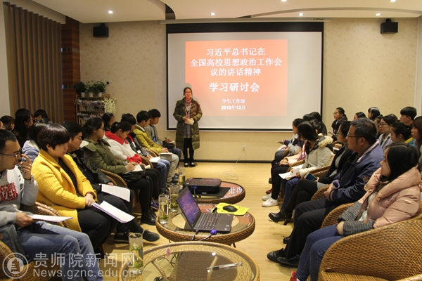 会上,薛璞带领大家认真学习了习近平总书记在全国思想政治工作会议中发表重要讲话的内容:高校思想政治工作关系高校培养什么样的人、如何培养人以及为谁培养人这个根本问题。要坚持把立德树人作为中心环节,把思想政治工作贯穿教育教学全过程,实现全程育人、全方位育人,努力开创我国高等教育事业发展新局面。