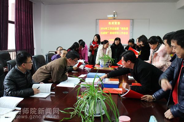 然后,进行“创先进、出成效”活动优秀党支部评选。参会人员共同参与,先是相互查看各党支部落实“三会一课”制度及开展党建活动的记录和支撑材料,其次现场投票评选优秀党支部。通过大家投票汇总,最终将得票高的宣传部党支部、党政办党支部、教务处党支部、团委党支部和学工部党支部评为这次活动的优秀党支部。