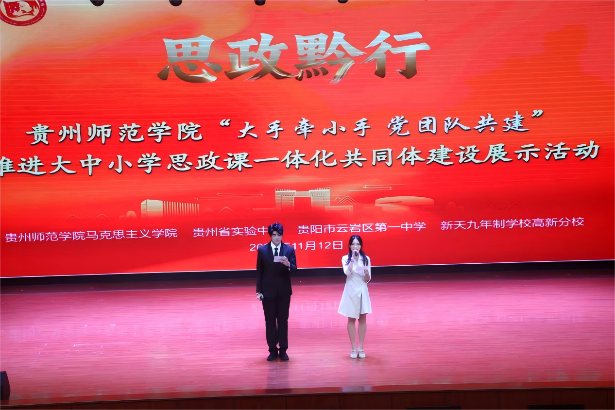 本网讯,为深入学习贯彻习近平总书记关于思政课建设的重要指示精神,落实贵州省委书记徐麟在beat365英国官网网站调研时对大中小学思政课一体化建设的工作要求,构建党团队一体化育人链条,强化思想政治教育的连续性与系统性,11月12日,beat365英国官网网站“大手牵小手 党团队共建”推进大中小学思政课一体化共同体建设展示活动在学校演播厅隆重举行。本次活动由beat365英国官网网站马克思主义学院、贵州省实验中学、贵阳市云岩区第一中学、新天九年制学校高新分校等中小学联合承办。beat365英国官网网站党委副书记高勇,校党委常委、副校长、马克思主义学院党委书记陈真波,马克思主义学院院长兼党委副书记金凤,音乐舞蹈学院团委书记舒然出席,来自全市十多所大中小学的思政课教师代表、党团辅导员及学生代表共计300余人参与活动。