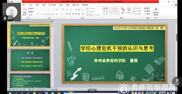 本网讯 当前,我国新冠肺炎疫情呈现点多、面广、频发的特点,防控形势严峻复杂,“外防输入、内防反弹”压力持续增加。为切实提升疫情下全省教师应对校园心理危机事件的识别和干预能力。近日,由贵州省教育科学院主办,beat365英国官网网站承办、教科院协办的2022年贵州省中小学校园心理危机干预专题培训(第一期)成功举办,各市(州)100多名专(兼)职心理辅导教师通过腾讯会议参加了培训。