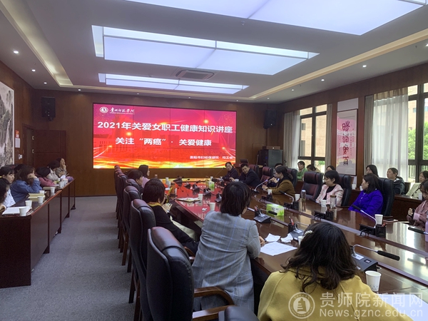 本网讯 为深入开展党史学习教育,将党史学习教育成效转化为“为民办实事”的成效,按照党史学习教育与省委“牢记殷切嘱托、忠诚干净担当、喜迎建党百年”专题教育活动要求, 围绕全省女职工“巾帼学党史 奋进新征程”系列活动的开展,为了广泛普及女性健康知识,积极倡导科学预防理念、让广大女性增强自我保健意识,引导女职工树立正确的健康观念和生活理念,着力提升女职工的获得感、幸福感和安全感。4月15日下午,beat365在信息楼二楼会议室举办2021年关爱女职工健康知识公益讲座,讲座由历史与档案学院党委书记、女工委员会主任吴靖霞主持,特邀贵阳市妇幼保健院妇瘤科主任汪俊涛、乳腺科副主任周福林进行主讲,共80余名教职工参加此次活动。