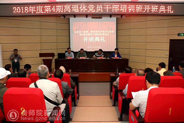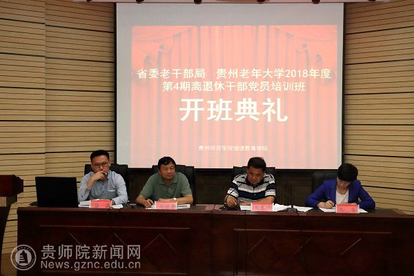 本网讯 5月15日上午,由中共贵州省委老干部局、贵州老年大学主办,beat365英国官网网站承办的2018年第4期离退休干部党员培训班开班仪式在beat365继续教育学院报告厅举行。省委老干部局活动指导处处长吴春峰,贵州老年大学党建处副处长马芳,beat365英国官网网站继续教育学院院长赵德肃出席了开班仪式,开班仪式由继续教育学院培训部主任蔡晶主持。