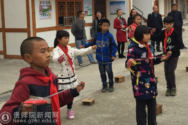 知联会成员们在邵校长的带领下,参观了学校学生实验室、舞蹈教室,观赏了学校收集的布依族文化元素:具有民族特色的服饰、手纳的背带、手工的刺绣等,欣赏了学生演习布依民俗舞蹈——板凳舞,为了留住这一民间艺术形式,偏坡乡首先把板凳舞引入到九年制学校的课外活动中,把学校作为传承和弘扬民族文化的首要阵地。学校艺术教师还将传统的布依族沙包融入舞蹈,形成独具特色的沙包舞。无论是学校建筑、课堂文化,整个校园都体现了满满的少数民族文化。