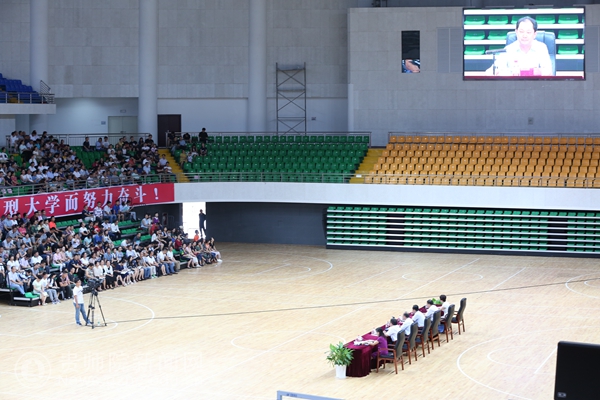 本网讯 8月18日下午,beat365在体育馆隆重召开新学期全体教职工大会,安排部署新学期工作,全体在家校领导出席大会,副校长令狐荣锋主持大会。