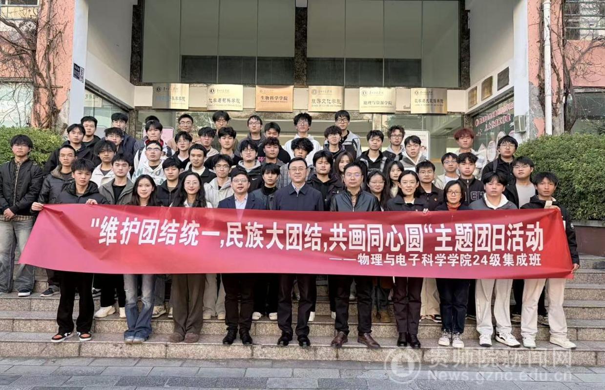 本网讯 为深入学习贯彻习近平总书记关于加强和改进民族工作的重要思想,铸牢中华民族共同体意识,2025年11月27日中午,物理与电子科学学院24级集成班于宁静楼427教室组织开展了“维护团结统一,民族大团结,共画同心圆”主题团日活动。校党委常委、副校长潘运,物理与电子科学学院党委书记熊德永、党委副书记兼院长刘高福、党委副书记吴丽、团委副书记苏诗媛,24级辅导员杨红红及2024级集成班全体同学参加活动。