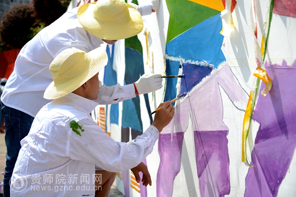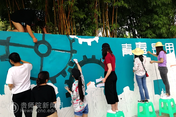 在接下来的两天里,同学们分工明确:有的负责构图,在墙体上勾勒出清晰的轮廓;有的负责调色,有的负责涂色,同学们拿起各式的画笔在墙体上细致涂刷,使得文化墙逐渐生动起来。经过三天不分昼夜的奋战,师生们互相配合,通力协作,精益求精,不断完善画面细节,最终圆满的完成了奋斗广场的壁画活动。