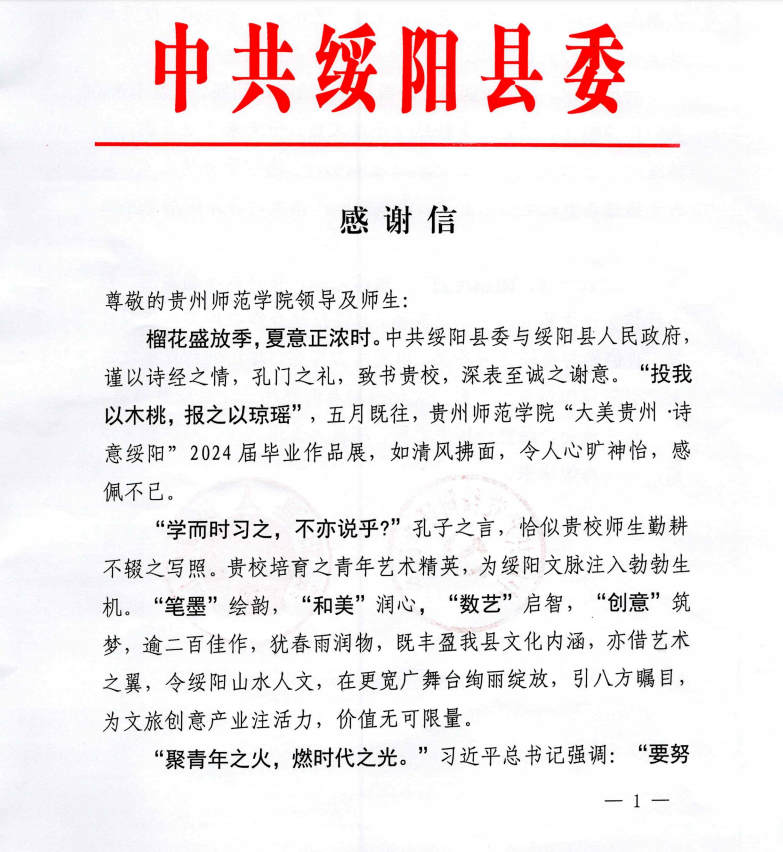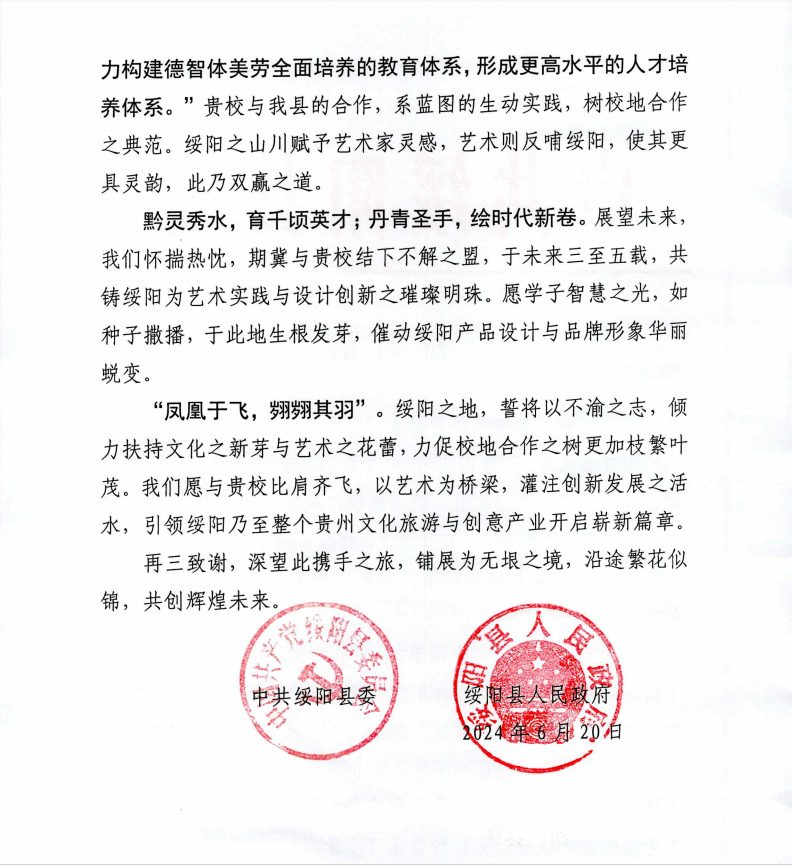 本网讯 近日,beat365与绥阳的校地合作再次传来佳音。美术与设计学院的毕业设计展览广受赞誉,绥阳县政府特地致函并赠予牌匾,以表彰beat365在合作中的贡献和努力。这一举措不仅彰显了beat365与地方合作的深厚情谊,也为beat365的未来发展开辟了新的篇章。