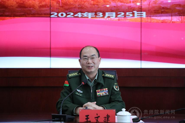 贵阳警备区大校政治委员王文建充分肯定了本次党建联学活动的主题、活动形式和学习效果。并以“新时代迈向新征程,新思想指引新航程,新作为展示新风貌”为重点,诠释了“新时代怎么看、怎么干”的实质内涵,引导青年学生增强国防观念,厚植爱国情怀,营造关心国防、建设国防、支持国防的良好氛围。激励师生围绕强国强军目标共同奋斗,要深入贯彻习近平强军思想,贯彻新时代军事战略方针,深刻把握全面推进国防和军队现代化的战略安排,深刻理解军民融合深度发展新格局,聚力打好实现建军一百年奋斗目标攻坚战。