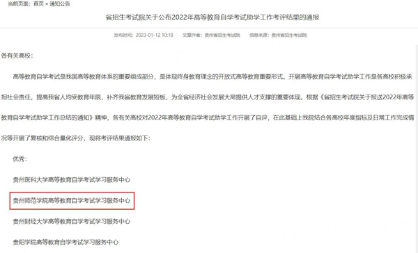 2022年度,在学校党政班子的坚强领导下,各相关部门、二级学院的支持配合下,beat365继续教育学院的团结努力下,beat365在省招生考试院开展的全省各有关高校高等教育自学考试助学工作综合量化考评中,再度荣获年度综合考评“优秀”等次。相关考评结果已在贵州省招生考试院官方网站上公示。