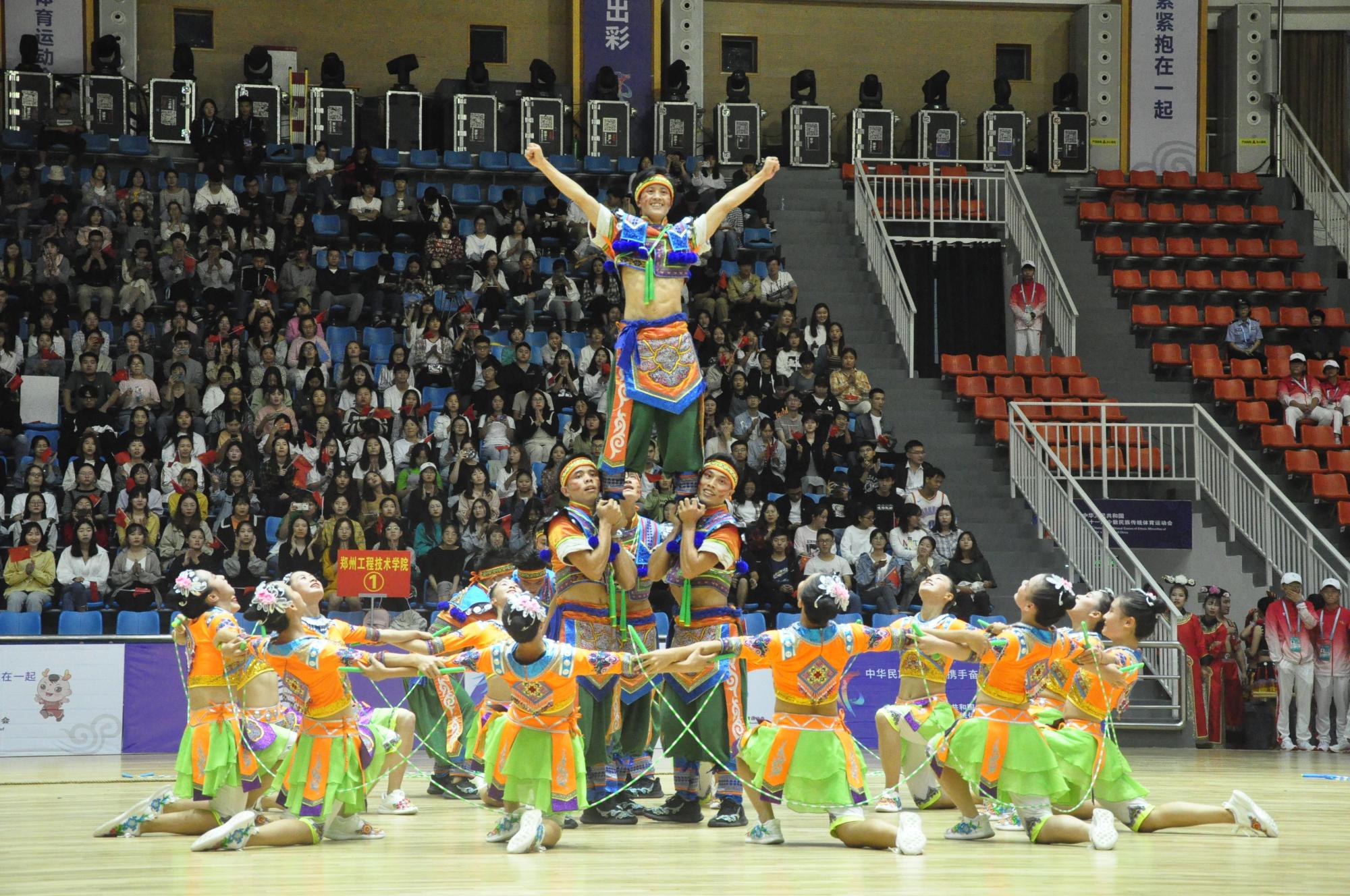 9月15日晚,第十一届全国少数民族传统体育运动会表演项目颁奖晚会在郑州工程技术学院体育馆举行。除为获奖者颁奖外,27支代表队分为上、下半场进行表演项目展示。他们将民族服饰、生活习俗与艺术表演结合在一起,充分展示了各民族的独有风情和文化魅力,精彩的表演燃爆全场。