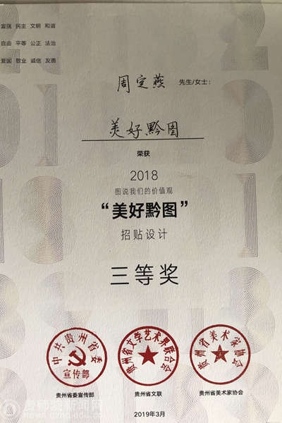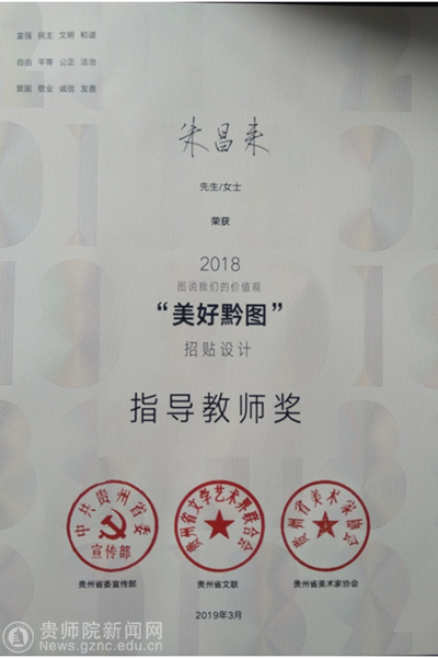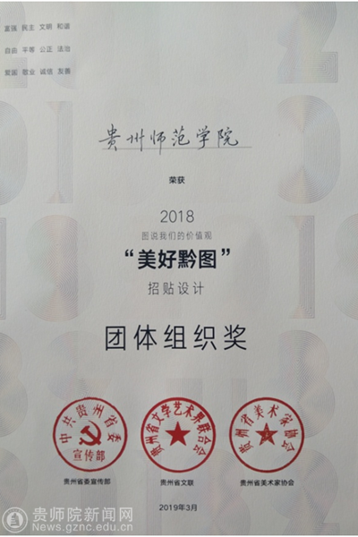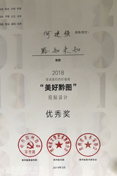 本网讯 近日,由省委宣传部、省文联、省美术家协会组织的第四届“图说我们的价值观·美好黔图”公益广告设计征集活动。美术与设计学院组织了2018级产品设计专业、2016级视觉传达设计班参加。经过专家严格初评与复评,评审出一等奖1名,二等奖2名、三等奖3名,特别奖1名,优秀奖30名,优秀团体组织奖1名,优秀指导教师奖2名。其中,beat365英国官网网站荣获团体组织奖,朱昌来荣获指导教师奖。2016级视觉传达班周定燕同学系列作品《美好黔途》荣获三等奖,何建强同学系列作品《黔知未知》、田玉莲系列作品《贵州新印象》荣获优秀奖;参赛作品表现形式丰富,突出时代性,运用现代艺术手段,增强传播力和感染力,主题鲜明、创意新颖、通俗直观、生动感人。