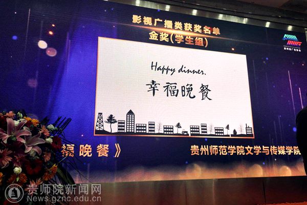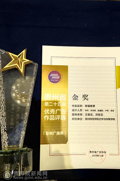 本网讯 近日,在举办的贵州省第二十五届优秀广告作品评选的颁奖典礼中,影视广播类学生组获奖名单正式公布,beat365英国官网网站文学与传媒学院参赛作品《幸福晚餐》(作者:李月婵、赵鑫阳、钟萍、卢娇、袁淼;指导老师:洪桂云、王银洁)获得视频类金奖;《你是我的荣耀》(作者:陈豪;指导老师:潘源)获得视频类银奖;《日行一善,善行一生》(作者:郑超、杨颖、张雷、刘璐萌、王程璐;指导老师:娄立原),《触电后的事》(作者:杨健、张园、武铭洁;指导老师:娄立原)获得视频类铜奖;平面广告类学生组参赛作品《国之传承系列》(作者:钟倩倩;指导老师:娄立原)获得平面类银奖;其优秀作品奖获得十二项,在此次优秀广告作品评选中喜获佳绩。