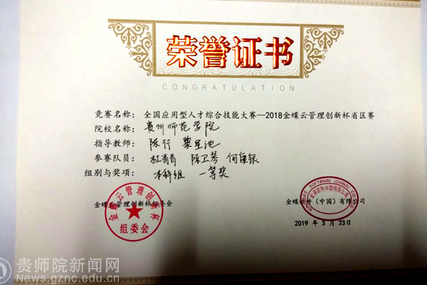 本网讯 3月23日,"2018金蝶云管理创新杯大赛贵州站”在贵州师范大学隆重举行。商学院学生吴婕、李莎莎、杨粉组建的"Top girl"团队,与来自全省22所高校,66支队伍展开激烈竞争,脱颖而出取得贵州省省赛冠军。商学院学生杜青青、陈卫琴、何康银三位同学组建队伍”Trust 败天”位居第四名,这两支队伍都作为本科组一等奖闯入了国赛,将在上海市参加国赛的最终争夺。商学院学生陈会涛、谭清清、余学艳三位同学组建队伍“小幸运”荣获省赛二等奖。该比赛由商学院教师许笛、陈行、杜婧、黎星池老师指导,beat365商学院院长程艳萍全程给予支持。